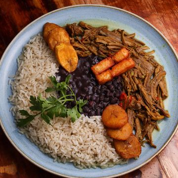 It is the national dish of Venezuelan gastronomy: Caraotas [black beans] + Shredded meat made with fried garlic, white onion and paprika in achiote oil, white rice, yellow banana coins and roasted peasant cheese.